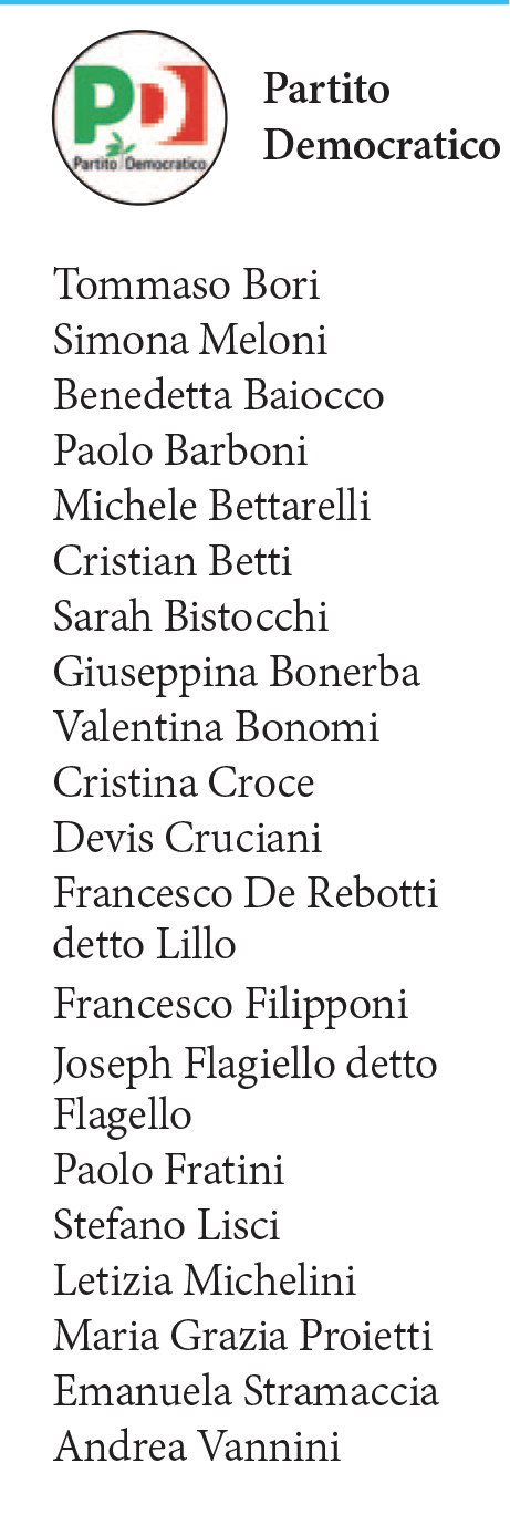 Da segnalare che purtroppo per un refuso di stampa, nella lista del Partito Democratico, non sono visibili i nomi degli ultimi due candidati in lista, ovvero Emanuela Stramaccia e Andrea Vannini. Oltre a scusarci con i due candidati per l’imperdonabile errore, qui in allegato pubblichiamo le due pagine delle liste e qui sotto la lista del PD con i nomi correttamente inseriti.