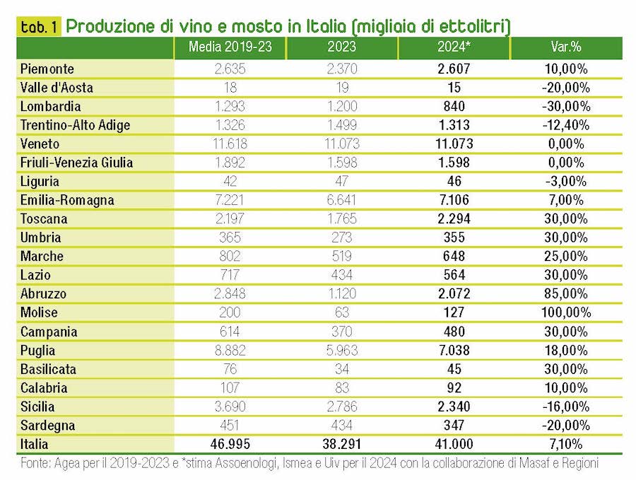A livello nazionale, sempre secondo le stime di Assoenologi, Ismea e Uiv, la produzione è passata da 38 milioni 291 mila ettolitri 41 milioni di ettolitri, con un incremento – come detto – del 7,1%. Un dato che, nonostante sia in aumento, resta di circa il 13% sotto quello della media di produzione 2019-2023, che si attestò a 46milioni 955mila ettolitri.