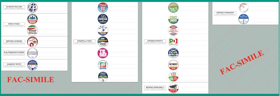 Per eleggere i componenti del Consiglio Regionale si potrà scegliere tra i candidati di 23 liste, di cui 7 ciascuna a sostegno delle due principali pretendenti alla carica di presidente, ovvero la presidente uscente Donatella Tesei, sostenuta dallo schieramento di centro destra, e Stefania Proietti, sindaco di Assisi, sostenuta dal cosiddetto “campo largo” di centrosinistra.