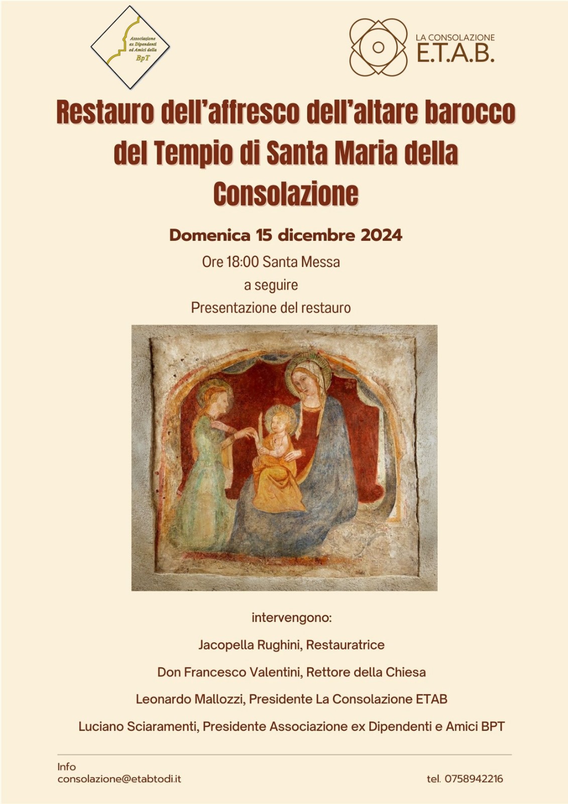 La Consolazione-Etab e l’Associazione Ex Dipendenti e Amici della Banca Popolare di Todi invitano la comunità cittadina a partecipare alla presentazione del restauro dell’affresco dell’altare barocco del Tempio di Santa Maria della Consolazione, rappresentante il matrimonio mistico di Santa Caterina.