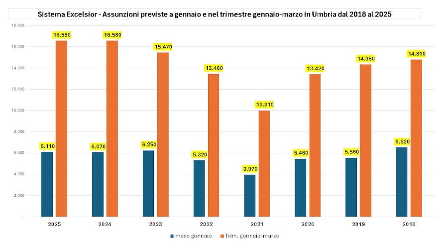 Il bollettino Excelsior di gennaio 2025, redatto da Unioncamere e dal Ministero del Lavoro registra 6.110 ingressi lavorativi previsti dalle imprese umbre nel mese di gennaio 2025, un leggero aumento rispetto ai 6.070 dello stesso mese nel 2024.