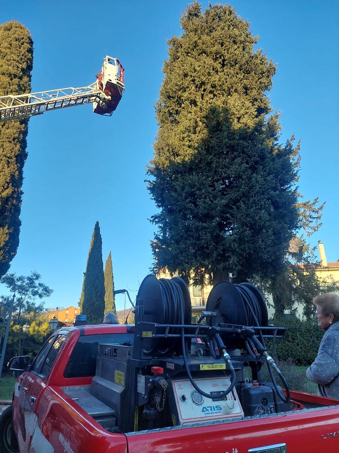 Pomeriggio movimentato a Massa Martana. Perla, una gattina scappata di casa e salita su di un cipresso da ormai quattro giorni, nei pressi della farmacia di Massa, ha fatto mobilitare le squadre dei Vigili del Fuoco di Todi e di Foligno.