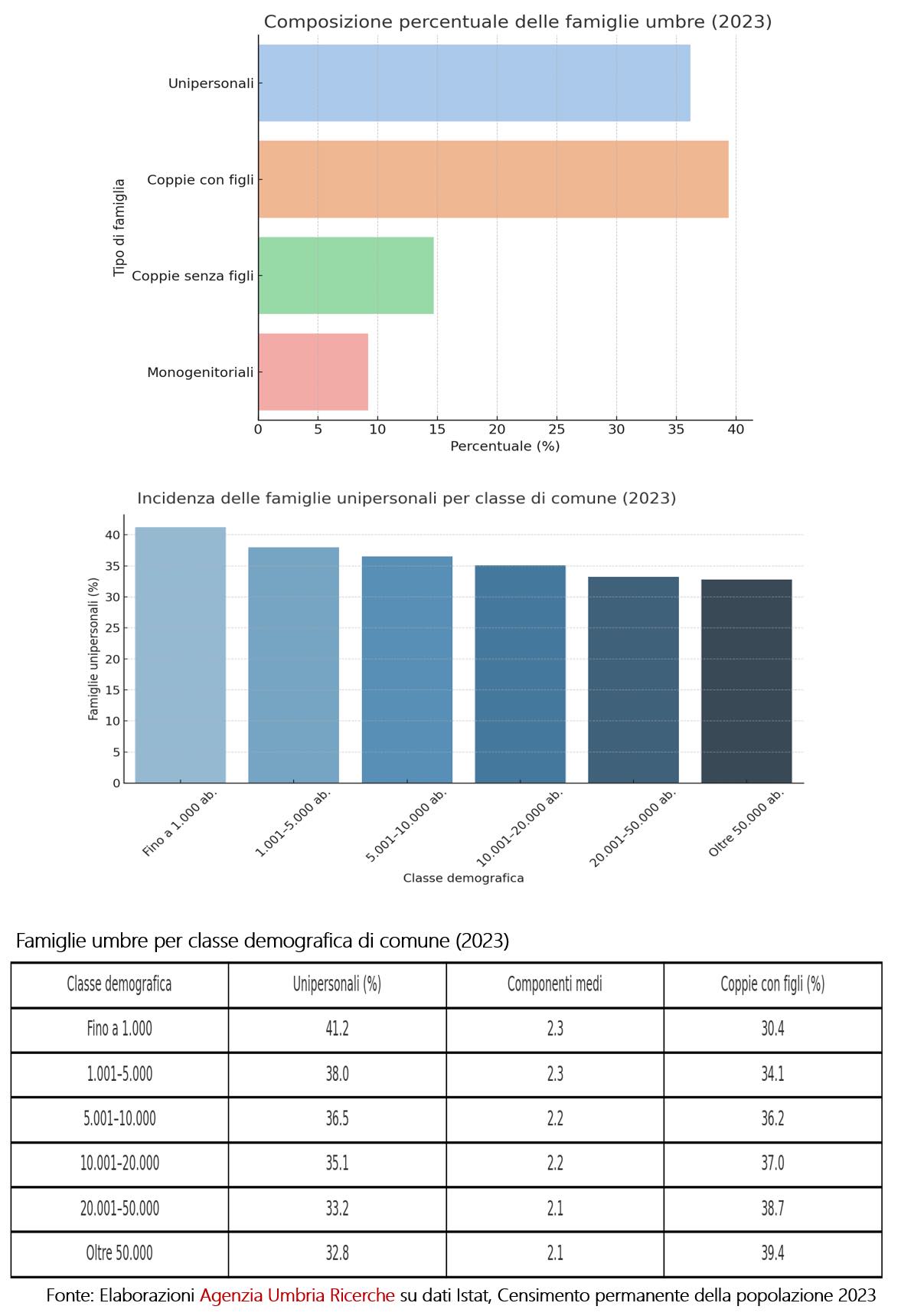 Una trasformazione profonda riguarda anche la dimensione numerica dei nuclei: le famiglie umbre hanno in media 2,2 componenti. Nei centri urbani, il dato scende a 2,1. Nei 3 comuni sopra i 50.000 abitanti, una famiglia su cinque ha un solo componente.
