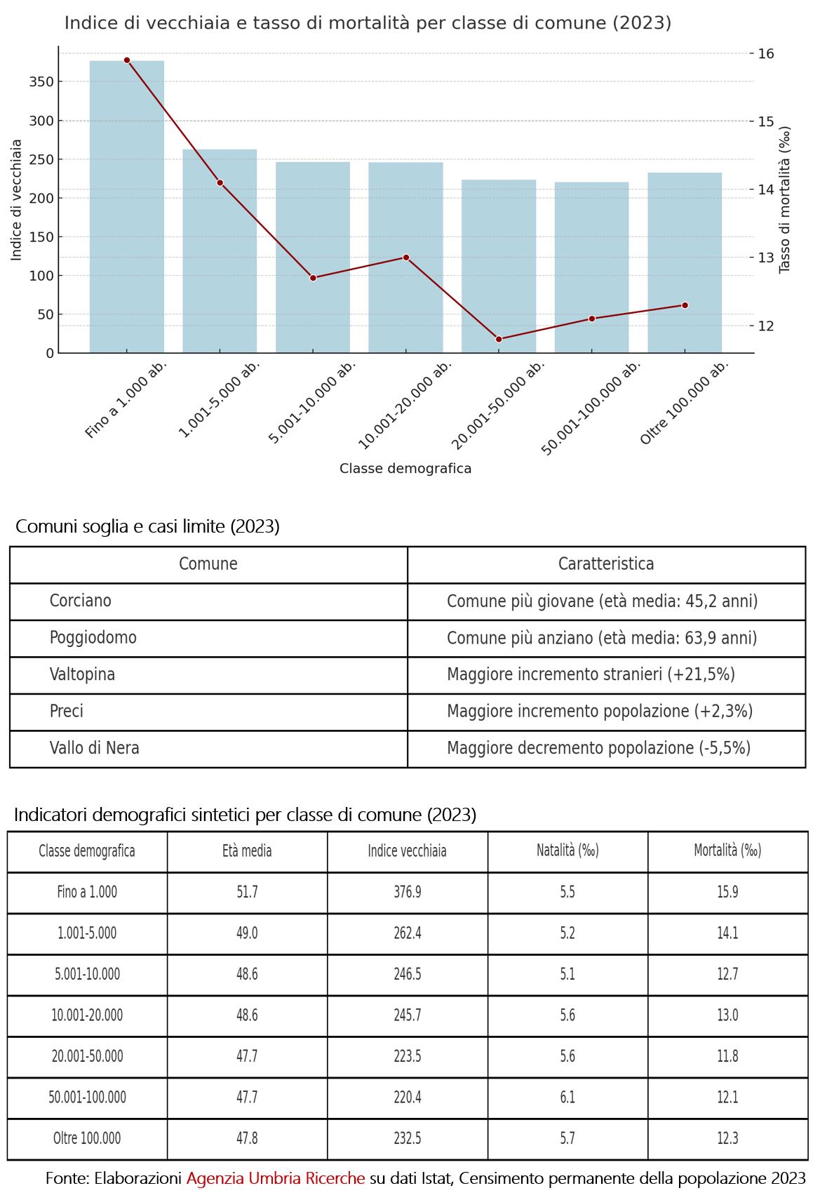 In questo contesto, a reggere meglio l’urto della contrazione sono soprattutto i centri più grandi. Oltre il 31% degli umbri vive nei due capoluoghi, Perugia e Terni, e un altro 20,5% nei sei comuni tra i 20 e i 50 mila abitanti. Qui si concentrano i volumi maggiori, i servizi e una certa “tenuta demografica”: l’età media si mantiene sotto i 48 anni, la presenza straniera è ben oltre l’11% e i tassi di natalità superano la media regionale.