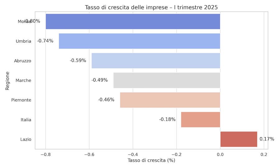 Il Lazio, ad esempio, cresce di 1.657 imprese (+0,28%), unico segno più tra le regioni italiane. Il Centro Italia nel complesso tiene (+422), ma Umbria e Marche (-0,30%) restano in difficoltà.
