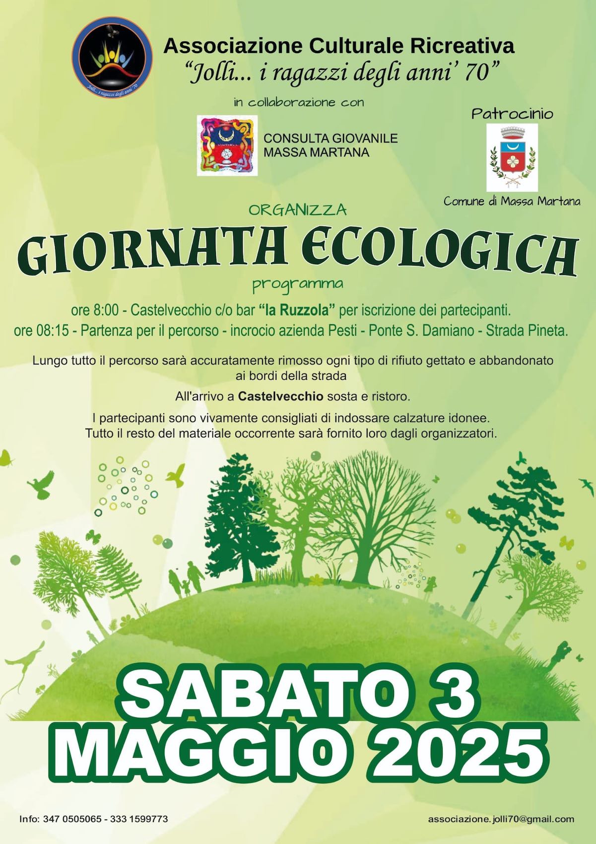 Sabato 3 maggio, l’Associazione “Jolli… i ragazzi degli anni ’70”, organizza una giornata ecologica in località Castelvecchio. Il programma della giornata nella locandina qui sotto.