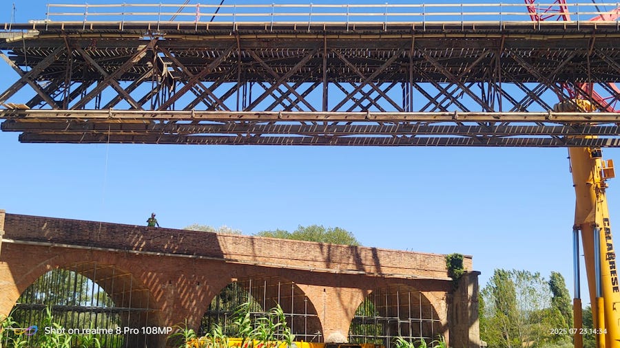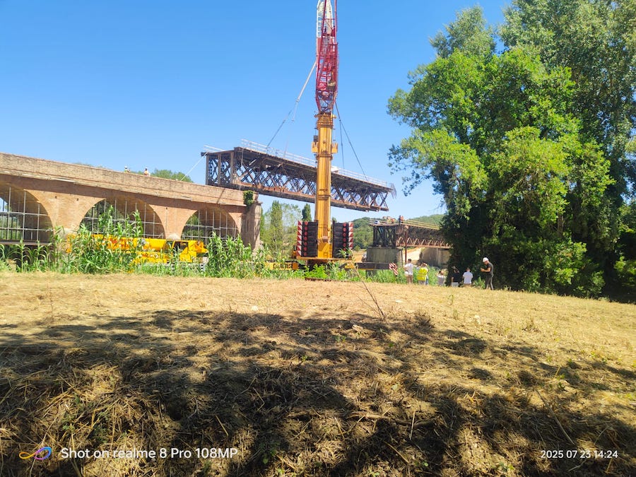 Nei giorni scorsi l’impresa appaltatrice dei lavori ha proceduto allo smontaggio del primo tronco metallico del ponte di circa 40 metri di lunghezza, ponendolo a terra, di cui si propongono alcune immagini (realizzate da Giovanni Ciani che si ringrazia).