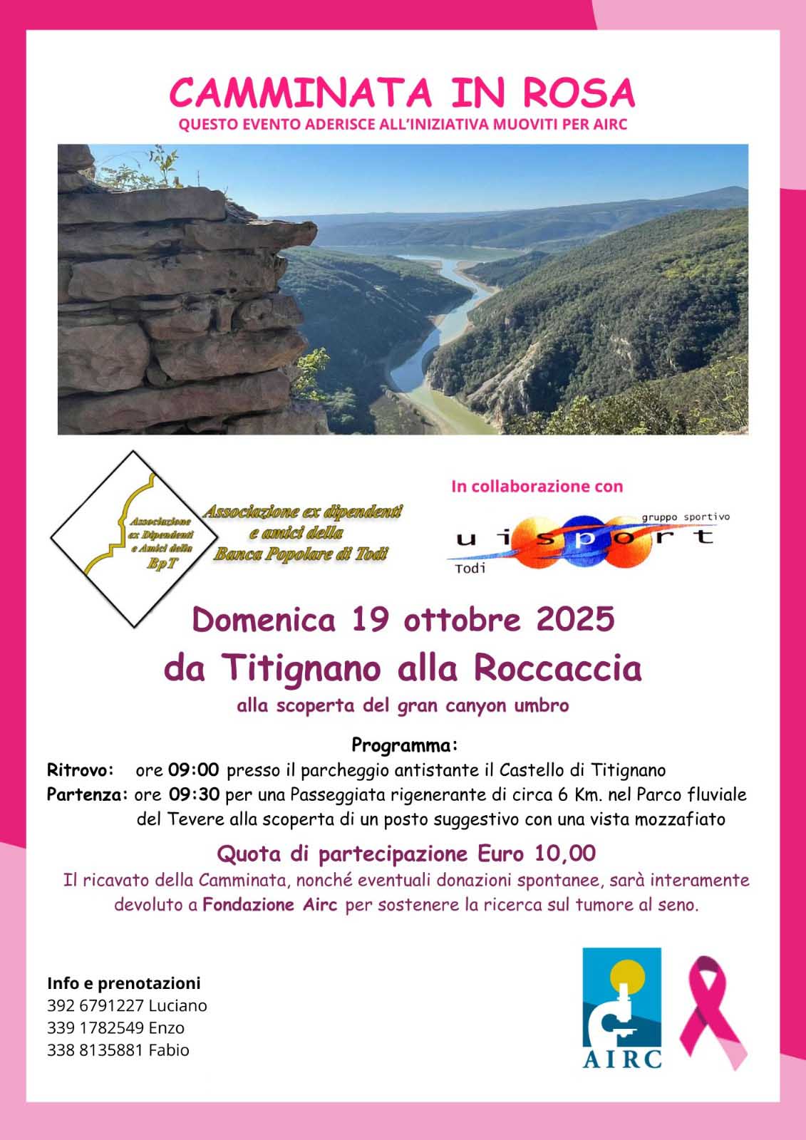 L’Associazione Ex Dipendenti e Amici della Banca Popolare di Todi, in collaborazione con i volontari locali dell’AIRC e del Gruppo Sportivo Uisport Avis Todi, rinnova con entusiasmo la sua adesione alla campagna Nastro Rosa AIRC, organizzando anche quest’anno la Camminata in Rosa, un evento aperto a tutti, dedicato alla solidarietà e alla bellezza del nostro territorio.