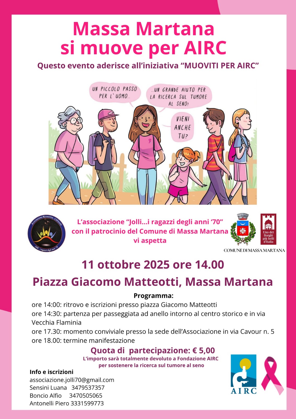 Sabato 11 ottobre a Massa Martana si svolgerà l’iniziativa promossa dall’AIRC a livello nazionale “Muoviti per AIRC”, patrocinato dal Comune di Massa Martana ed organizzato dall’Associazione locale “Jolli…i ragazzi degli anni ’70“.