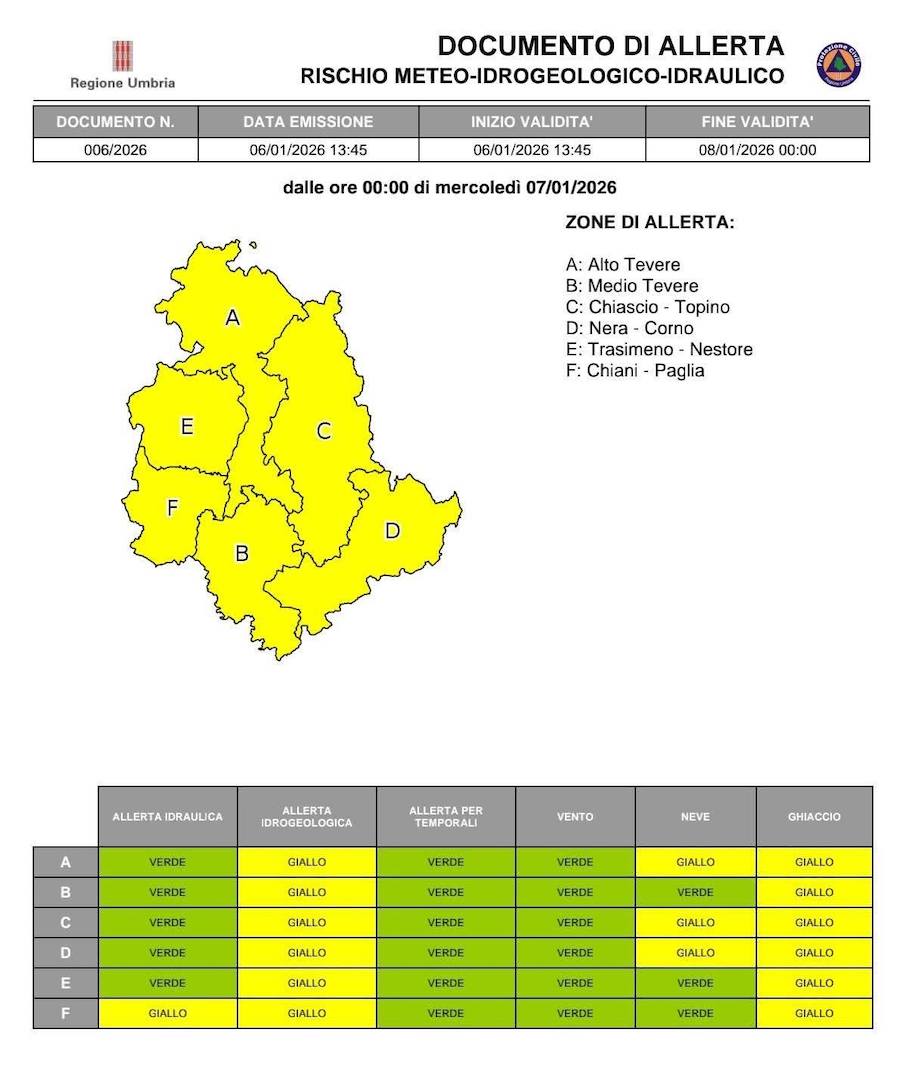 Per tutta la giornata di domani è stata diramata l’allerta meteo gialla su tutta la regione per rischio ghiaccio e rischio idrogeologico in alcune zone. Rischio neve anche per domani nell’alto Tevere, spoletino, folignate, valnerina.