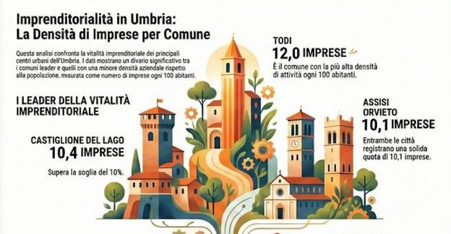 In coda alla graduatoria si collocano San Giustino (6,9 imprese ogni 100 aitanti), Amelia (7,9), Magione (8,0), Terni e Corciano (8,2). Tra gli altri municipi sopra i 10mila abitanti Spoleto presenta 8,8 imprese ogni 100 abitanti, Foligno 8,6 e Narni 8,3.