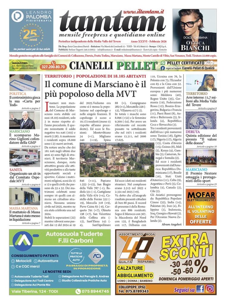 il comune di Marsciano si conferma il centro più popoloso della Media Valle del Tevere; a Todi prime manovre in vista delle elezioni 2027, con il centrosinistra che presenta la “Carta per Todi”; a Marsciano fa notizia la scomparsa di Marino Giglioni storico cofondatore della GMP; per la sanità, il Comitato Ospedale MVT elegge il nuovo direttivo ed organizza un sit-in davanti all’ospedale; a Massa Martana a rischio chiusura il mattatoio che è stato messo in liquidazione, con ricadute su di un ampio territorio; all’Area interna della Media Valle del Tevere vanno quasi 12 milioni di euro; la sindaca di Collazzone, Laura Antonelli, diventa presidente del GAL MVT; Monte Castello di Vibio è tra i 20 Paesi più belli d’Italia; a Deruta la quinta edizione del premio “Il valore delle donne”; per lo sport il Premio Nestore a Marsciano e i record degli atleti dell’Atletica Todi.