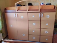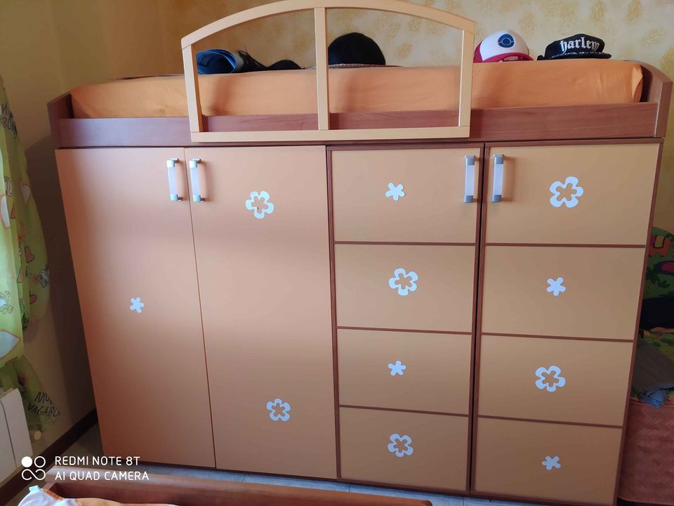 Camera con 3 letti, armadio a doppia profondità (1 metro) con 4 ante, ripiani interni e letto sovrastante con parapetto, cassettiera a 6 cassetti, 2 librerie, colonna con sportelli cassetti e vetrina, scrivania con ripiano estraibile e 4 cassetti, scala per raggiungere il terzo letto sopra l'armadio inclusa.