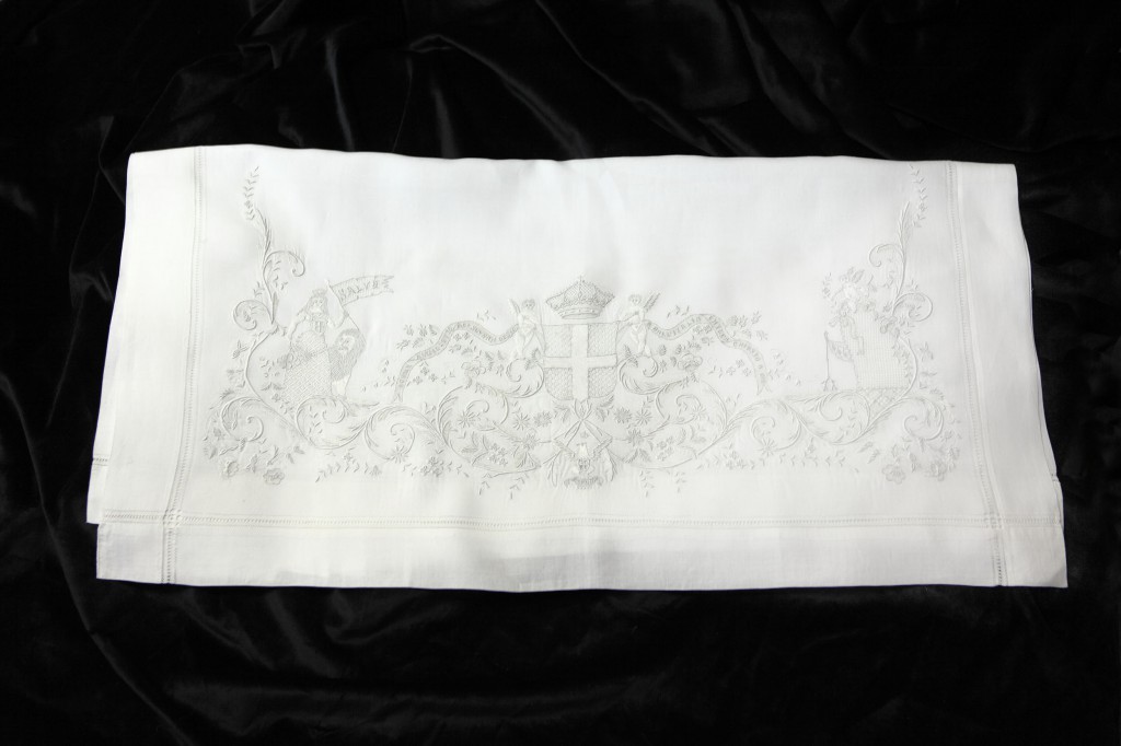 Si tratta di un lenzuolino, del 1869, che si ritiene facesse parte del corredo neonatale di Vittorio Emanuele III, Principe di Napoli, erede al trono d’Italia