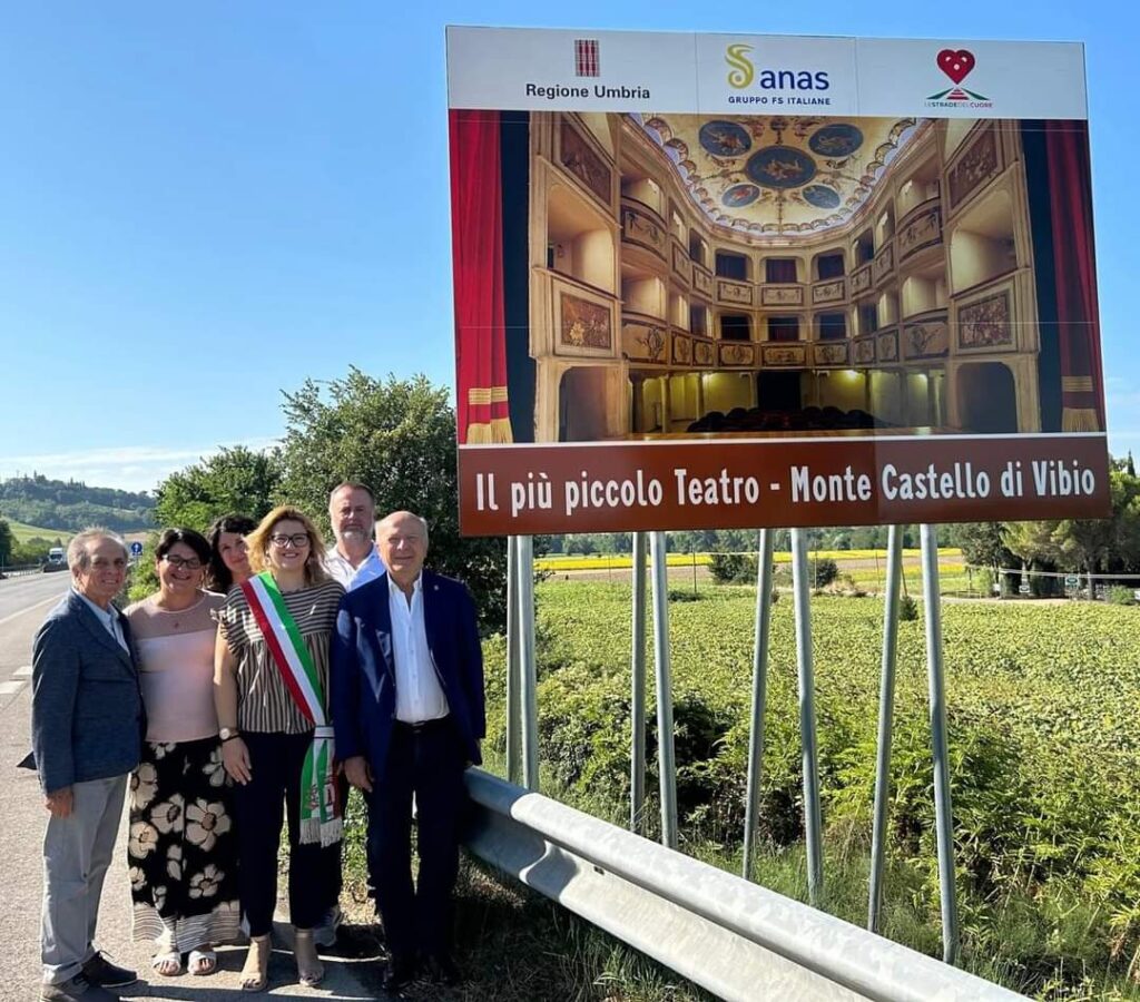 Monte Castello di Vibio si fa bella con il suo teatro più piccolo del mondo grazie al cartello installato in prossimità dell’uscita di Fratta Todina