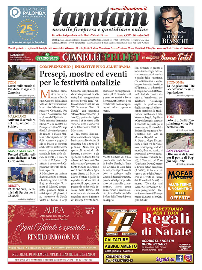 TamTam di dicembre è in distribuzione alle 22.000 famiglie degli 8 comuni della Media Valle del Tevere. In evidenza in questo numero: le iniziative per le festività natalizie nel comprensorio; a Todi programmati lavori sulle strade di Piagge e Canonica; in Consiglio Comunale a Todi avvicendamento tra Stefano Gimignani dimissionario…